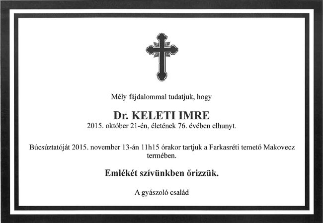 Mély fájdalommal tudatjuk, hogy Keleti Imre életének 75. évében elhunyt.